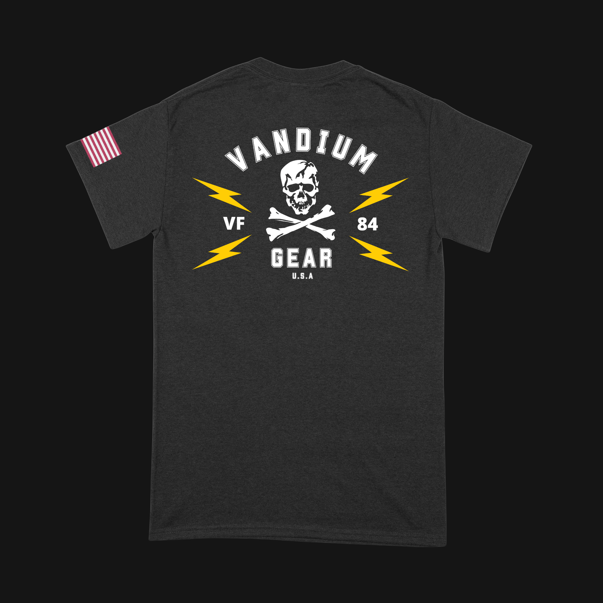 The Jolly Roger Tee is a tribute to the warriors who roll in silent and strike loud. Featuring a modernized skull and crossbones design with lightning bolts and the VF-84 nod to the legendary “Jolly Rogers” squadron, this shirt is all killer, no filler.